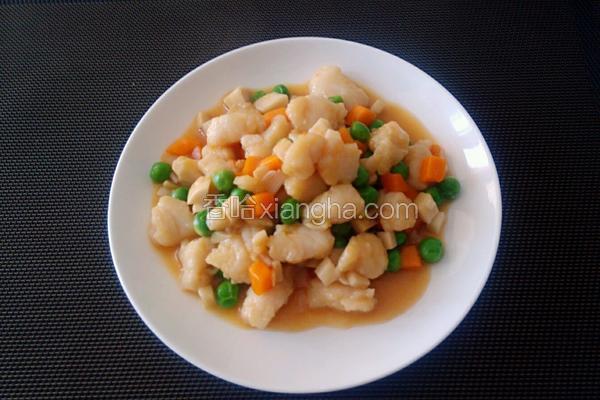 油锅烧热后转小火放入鱼肉丁 这样肉不容易粘在锅中 鱼肉也不容易碎 放入蔬菜后转中火正常炒即可 鱼肉很容易熟 配菜入锅稍煸炒后很快就可以出锅了哦
