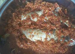 8/12 腌制好的明太鱼铺放在蒜片上。