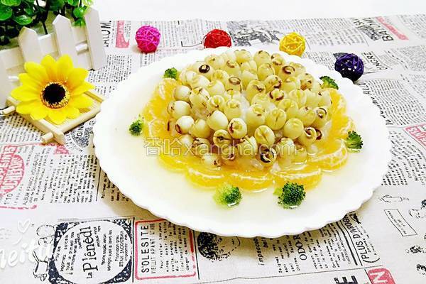 5/5 把熬好的蜜汁浇在莲子上,点缀上橘片和西蓝花即可。