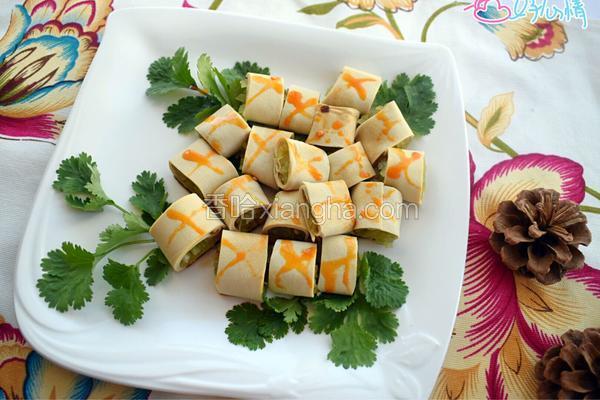 7/8 豆皮展开卷入笋丝,切段,和洗好的香菜一起摆盘。