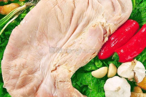 猪肚用清水冲干净,然后用盐、生粉多抓揉几次,冲净,放在热锅上两面煎,可以烫到一点异味都没有。